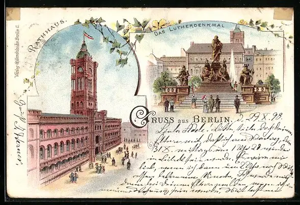 Lithographie Berlin, das Rote Rathaus, das Lutherdenkmal, Neuer Markt