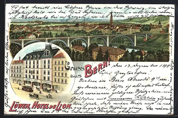 Lithographie Bern, Hotel Löwen / du Lion, Teilansicht mit Viadukt
