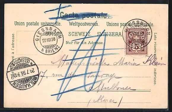 gelaufen 1898, Eckknick li. unten, rückseitig Oberflächenschaden, guter Zustand