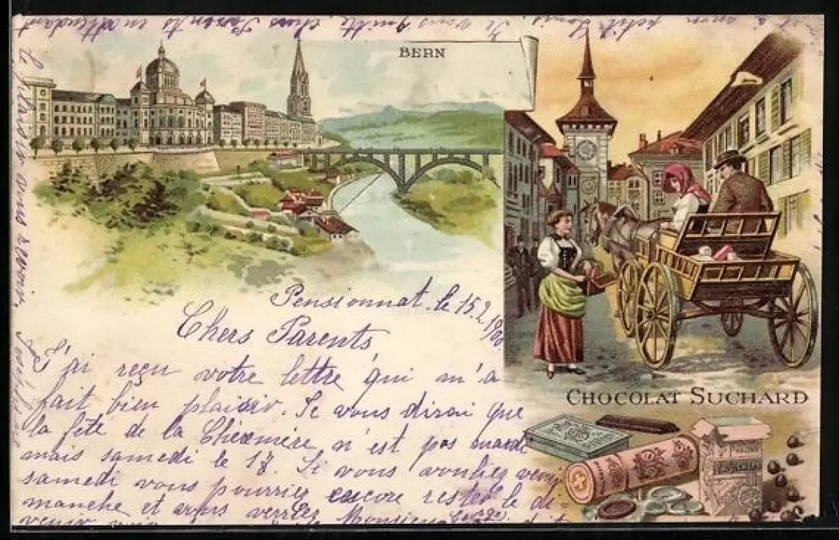 Lithographie Bern, Reklame für Chocolat Suchard, Ortspartie mit Brücke, Paar mit Kutsche, Kakao
