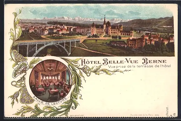 Lithographie Berne, Hotel Belle-Vue, Salle de lecture, Vue prise de la terrasse de l`hotel
