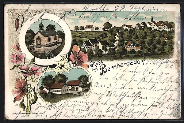 Lithographie Bernhardsdorf, Kapelle, Ortsansicht aus der Vogelschau