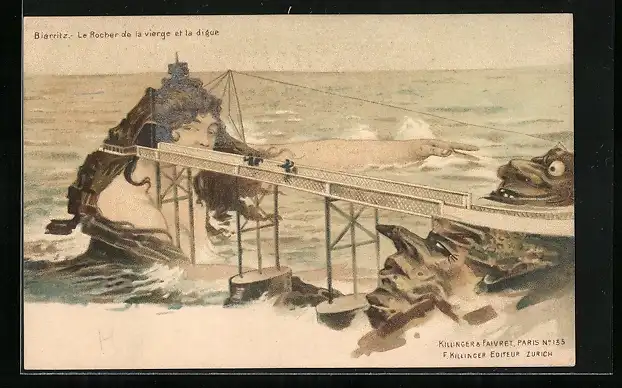 Lithographie Biarritz, Le Rocher de la vierge et la digue, Killinger & Faivret, Berg mit Gesicht / Berggesichter