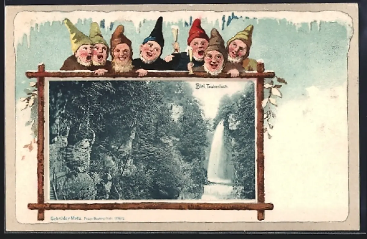 Lithographie Biel /Bienne, Wasserfall Taubeloch, betrunkene Zwerge