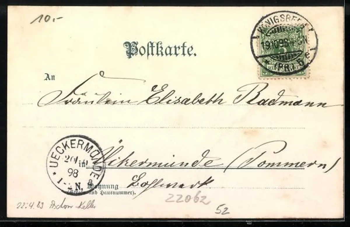 Personenbezogene Daten auf der Rückseite der Karte wurden durch blauen Textmarker unkenntlich gemacht. Die blauen Stellen sind auf die Vorderseite durchgeweicht und wirken sich negativ auf das Postkartenfoto aus