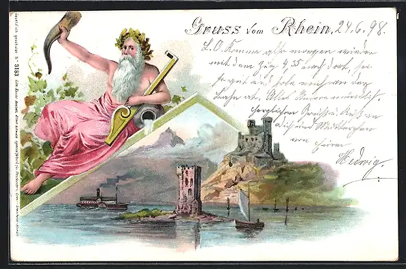 Lithographie Bingen, Ansicht mit Dampfschiff auf dem Rhein, Neptun