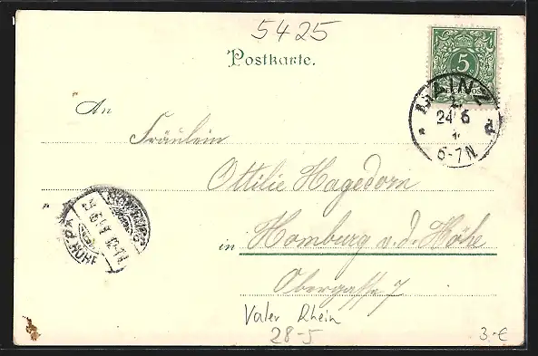 Personenbezogene Daten auf der Rückseite der Karte wurden durch blauen Textmarker unkenntlich gemacht. Die blauen Stellen sind auf die Vorderseite durchgeweicht und wirken sich negativ auf das Postkartenfoto aus