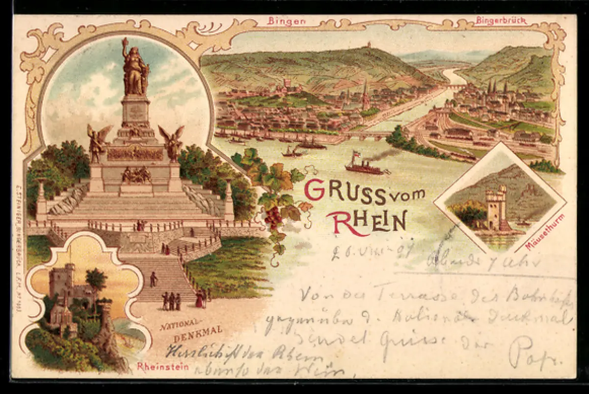 Lithographie Bingen, Bingerbrück, National Denkmal, Rheinstein