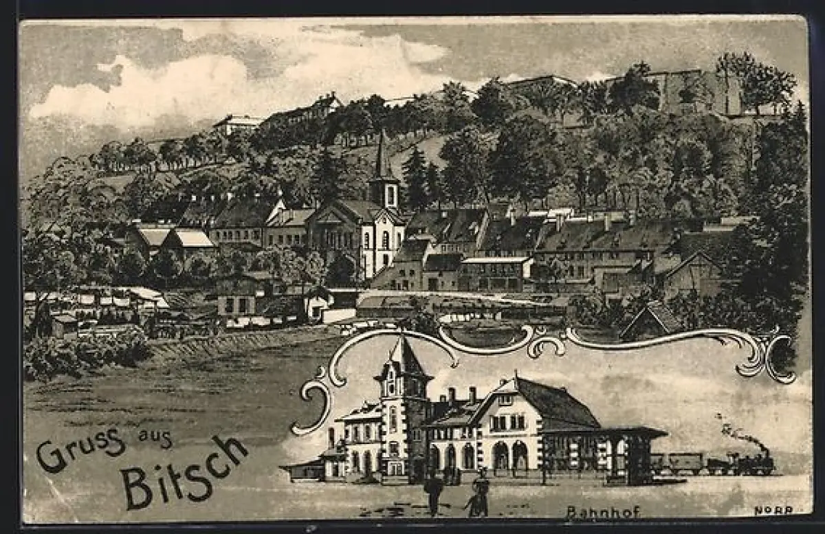 Lithographie Bitsch, Vue du village et de la gare avec collines en arrière-plan