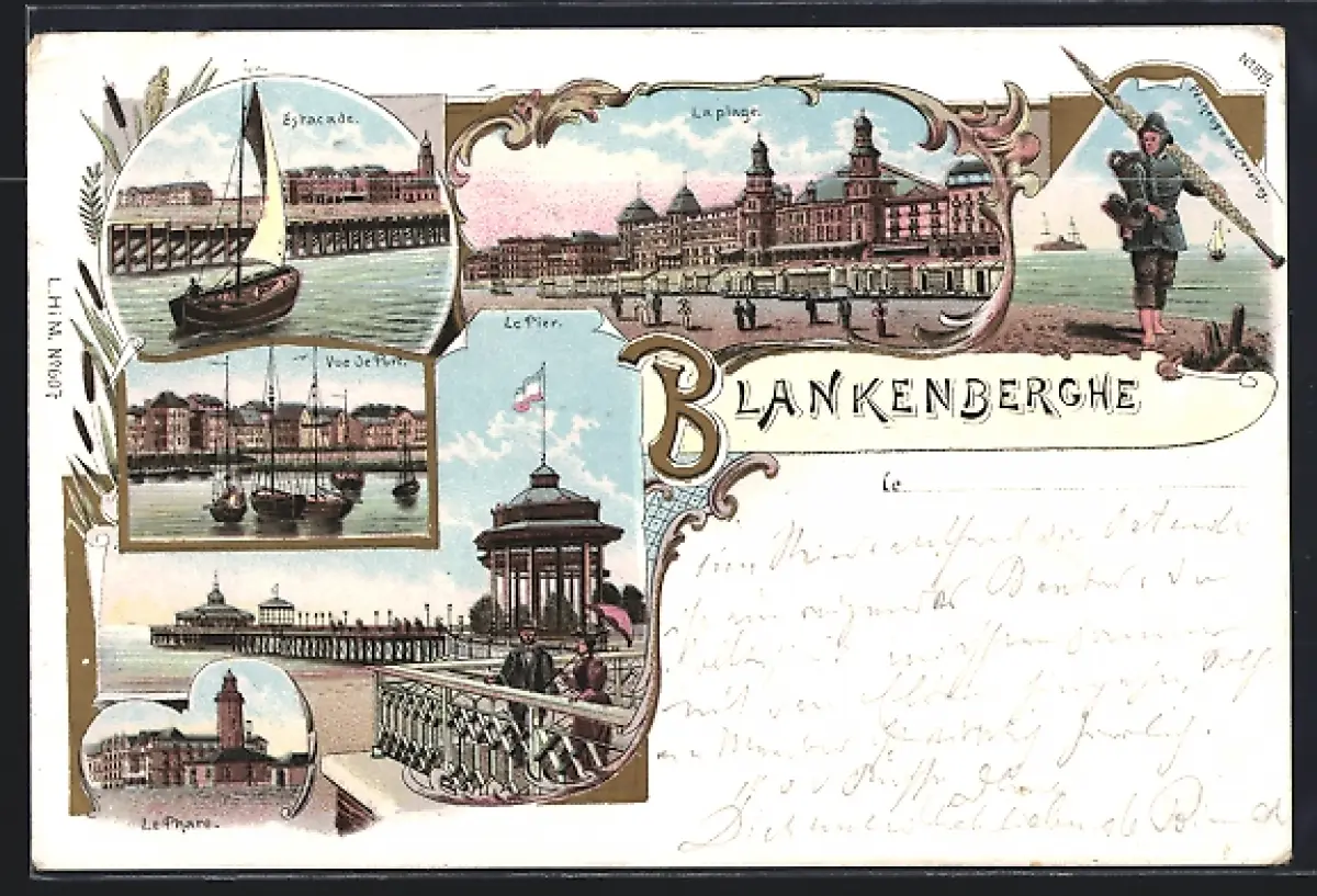 Lithographie Blankenberghe, La plage, Vue de Port, Le Pier