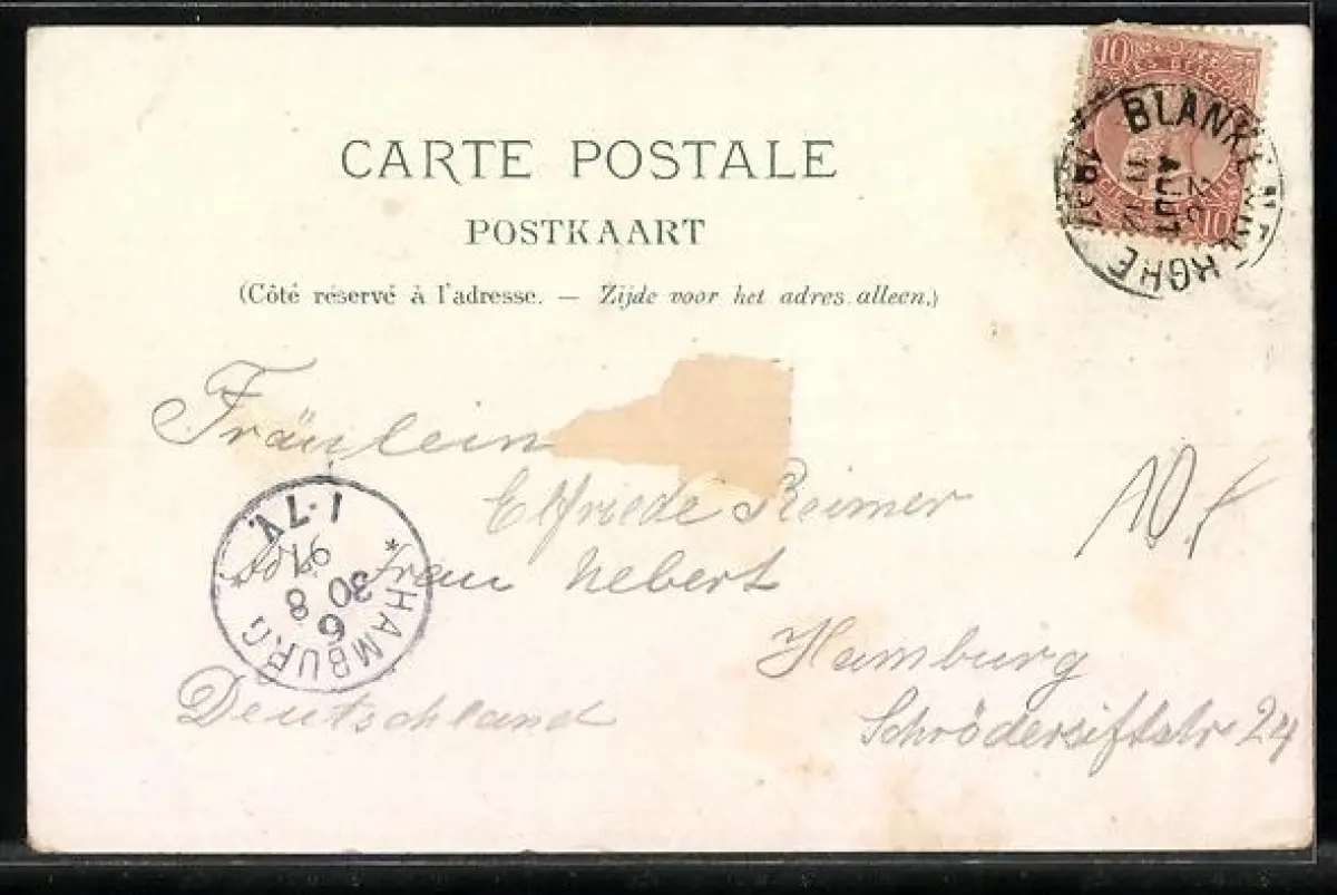 Personenbezogene Daten auf der Rückseite der Karte wurden durch blauen Textmarker unkenntlich gemacht. Die blauen Stellen sind auf die Vorderseite durchgeweicht und wirken sich negativ auf das Postkartenfoto aus