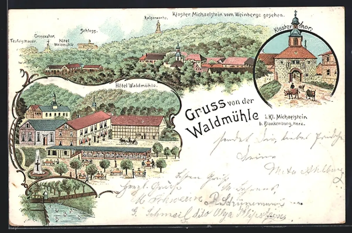 Lithographie Blankenburg i. H., Hotel Waldmühle in Kl. Michaelstein, Strassenpartie am Klostertor