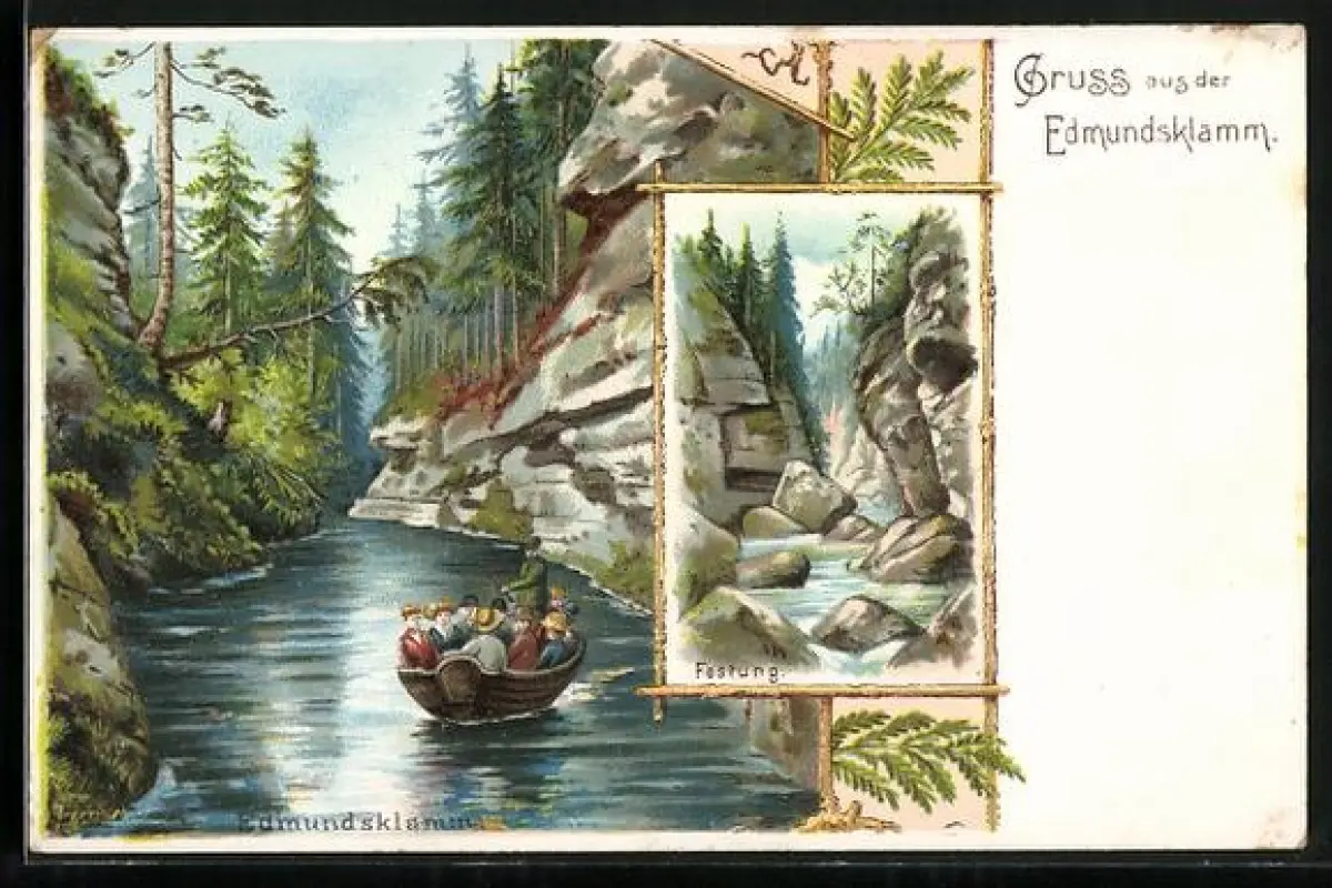 Lithographie Bodenbach, Ruderbootpartie in der Edmundsklamm, Festung