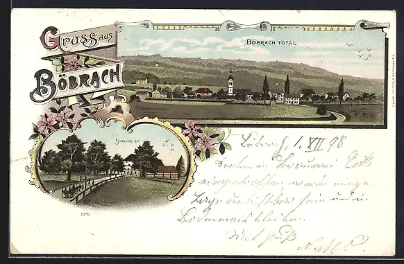 Lithographie Böbrach / bayr. Wald, Brauerei und Totalansicht