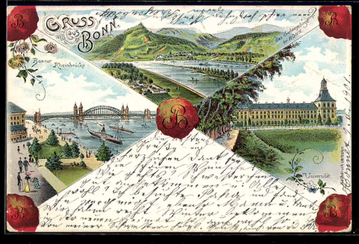 Lithographie Bonn, Gesamtansicht mit Rheinbrücke