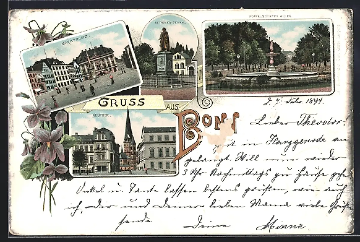 Lithographie Bonn, Neuthor, Beethoven Denkmal, Marktplatz