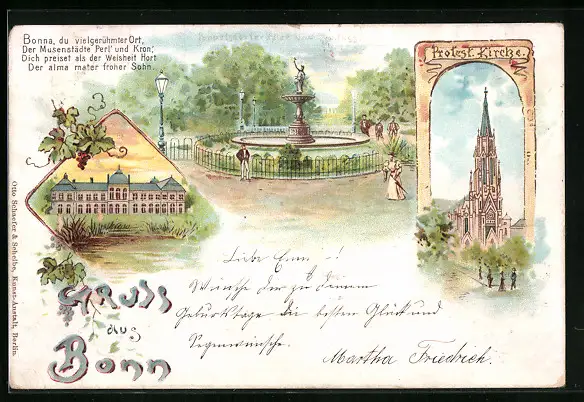 Lithographie Bonn, Protest. Kirche, Poppeldorfer Allee mit Platz, Schloss