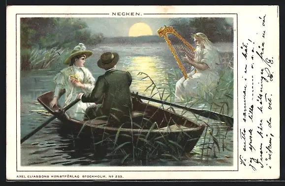 Lithographie Bootsfahrt eines Paares, Mann am Ufer mit einer Harfe