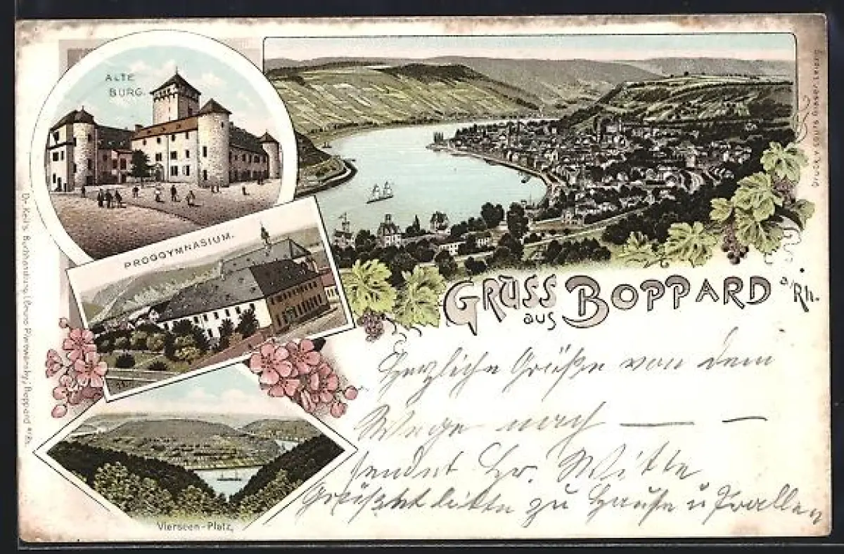 Lithographie Boppard a. Rhein, Progymnasium, Alte Burg, Vierseen-Platz