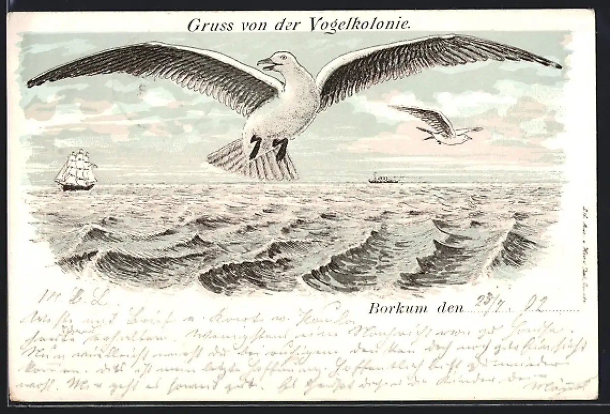 Lithographie Borkum, Gruss von der Vogelkolonie, Möwen