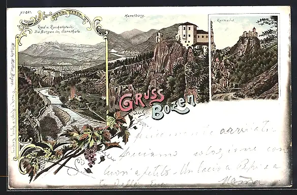 Lithographie Bozen, Haselburg, Karneid, Ried u. Runkelstein