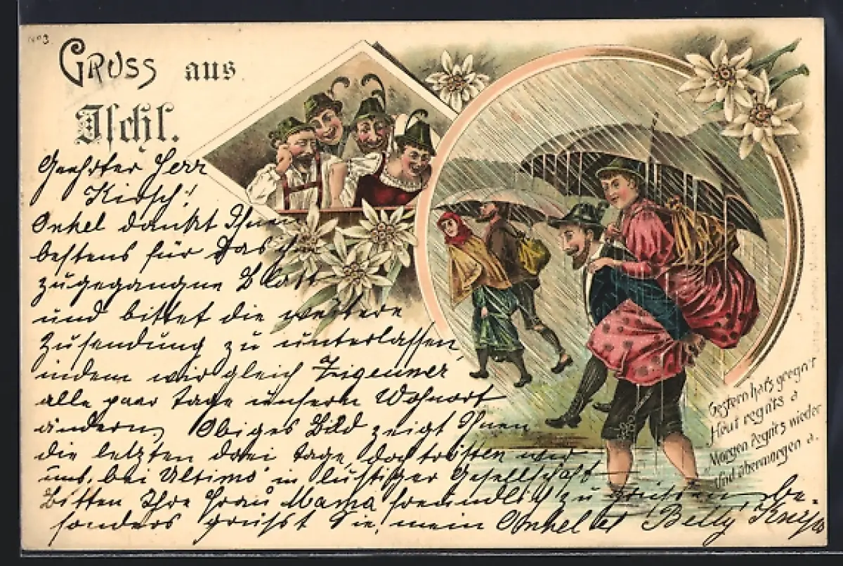 Lithographie Bozen, Leute bei Dauerregen auf einem Spaziergang