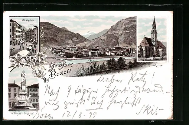 Lithographie Bozen, Obstplatz, Walther-Denkmal, Pfarrkirche