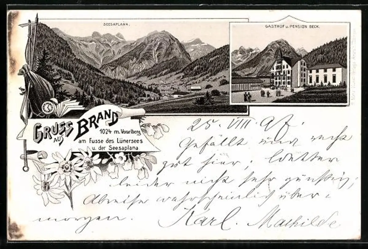 Lithographie Brand /Vorarlberg, Gasthof und Pension Beck, Seesaplana