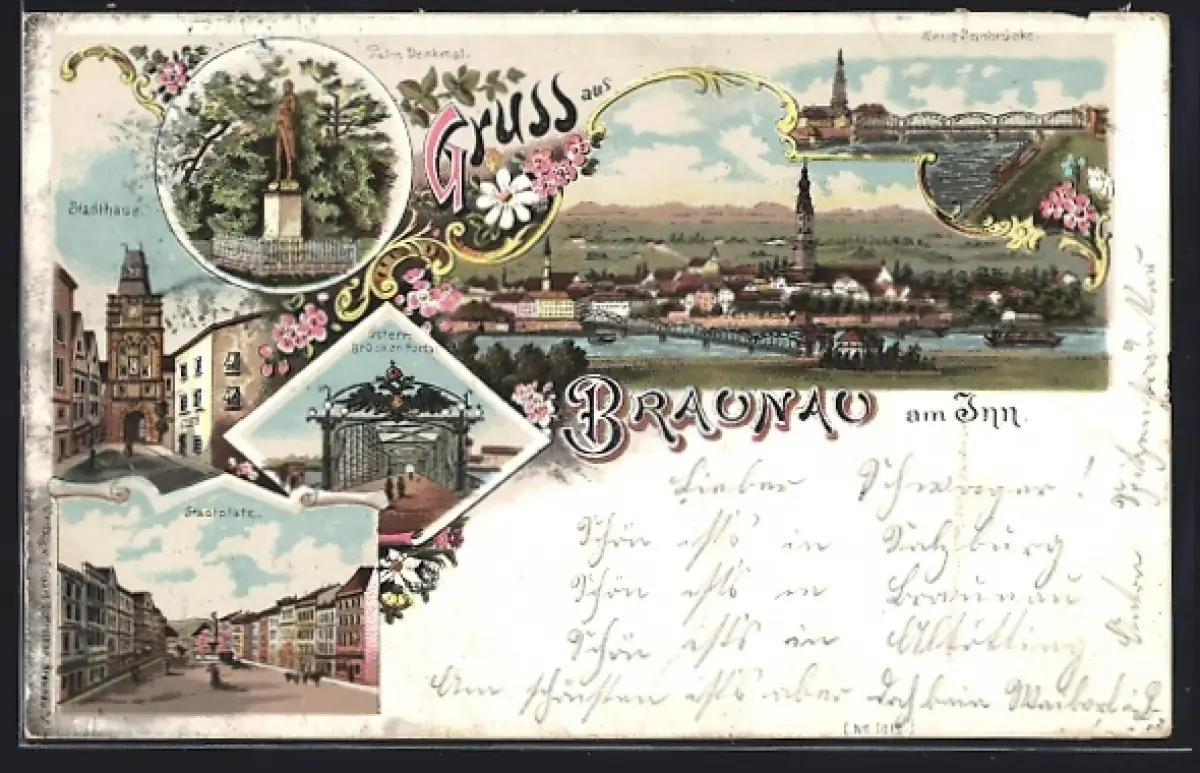 Lithographie Braunau a. Inn, Gesamtansicht, Neue Innbrücke, Palm Denkmal, Stadthaus, Österr. Brückenportal, Stadtplatz