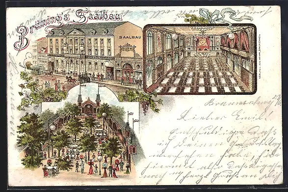 Lithographie Braunschweig, Gasthaus Brünning`s Saalbau, Innenansicht, Garten