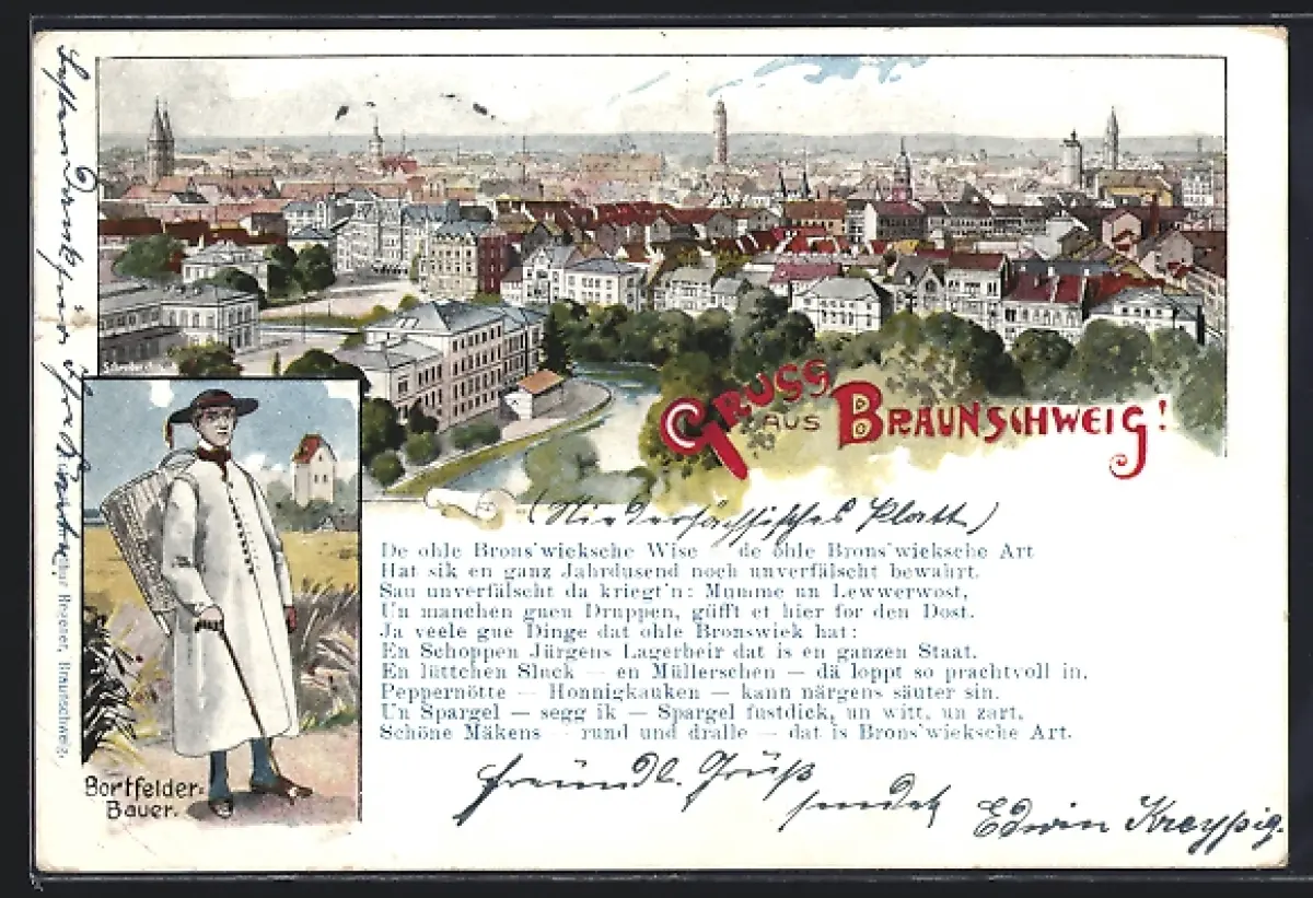 Lithographie Braunschweig, Gesamtansicht und Bortfelder Bauer