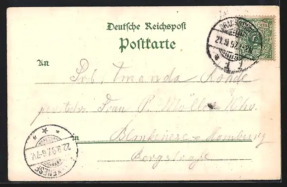 Personenbezogene Daten auf der Rückseite der Karte wurden durch blauen Textmarker unkenntlich gemacht. Die blauen Stellen sind auf die Vorderseite durchgeweicht und wirken sich negativ auf das Postkartenfoto aus