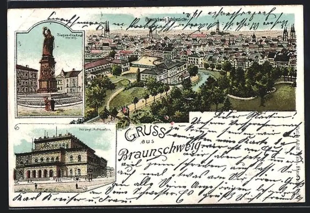 Lithographie Braunschweig, Totalansicht, Sieges-Denkmal, Herzogl. Hoftheater