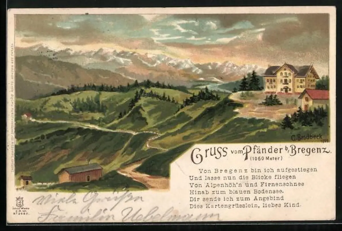 Lithographie Bregenz, Gruss vom Pfänder in der Dämmerung