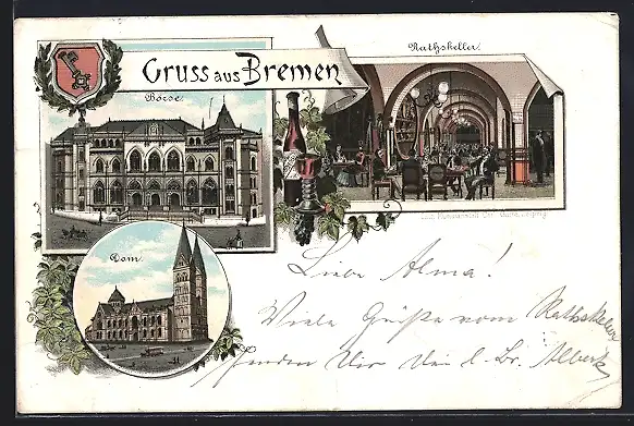 Lithographie Bremen, Gasthaus Ratskeller, Börse und Dom