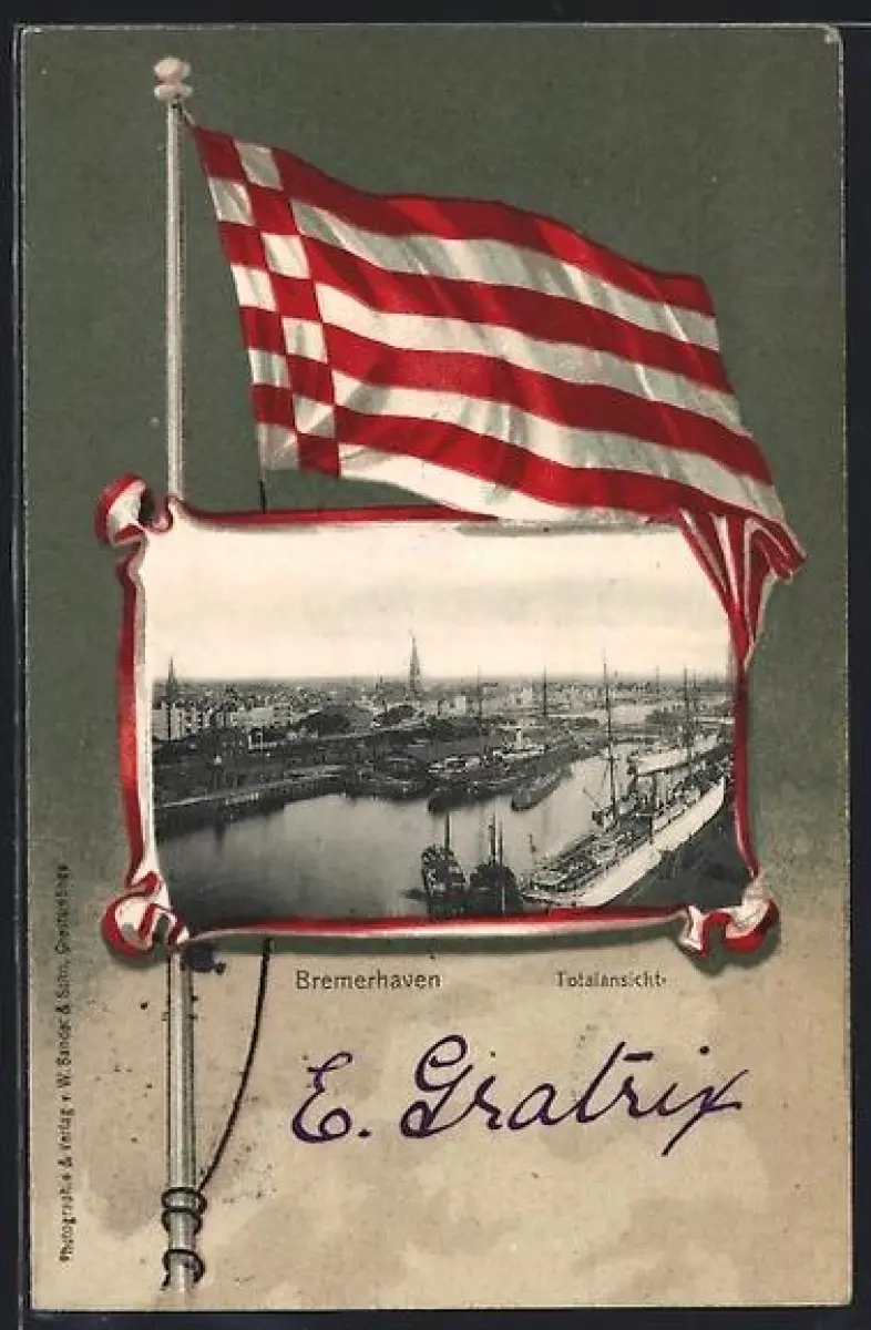 Lithographie Bremerhaven, Totalansicht, Flagge, Passepartout