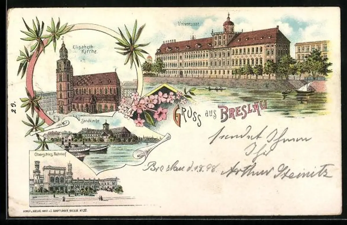 Lithographie Breslau, Oberschles. Bahnhof, Elisabeth Kirche, Universität, Sandkirche