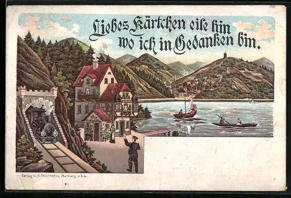 Lithographie Briefträger überbringt Brief, mit Eisenbahn