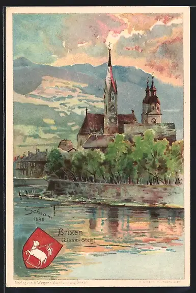 Lithographie Brixen, Eisak-Steig, Blick zur Kirche
