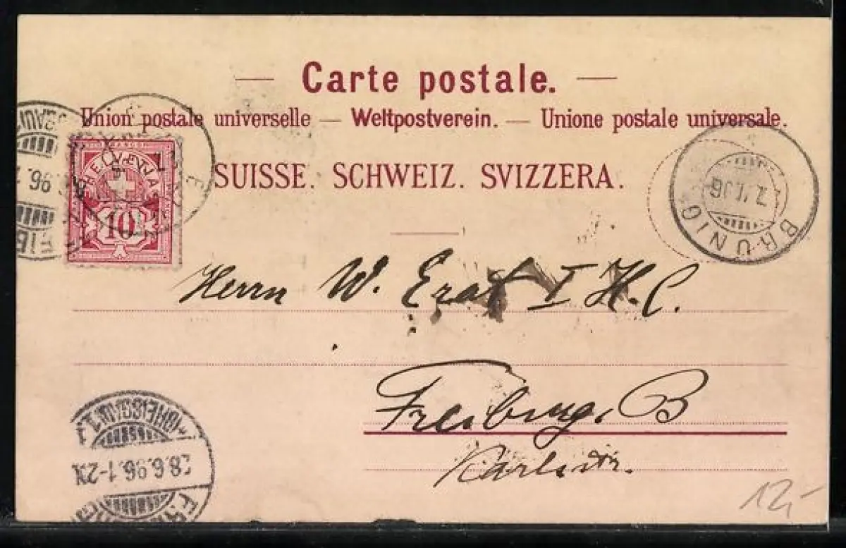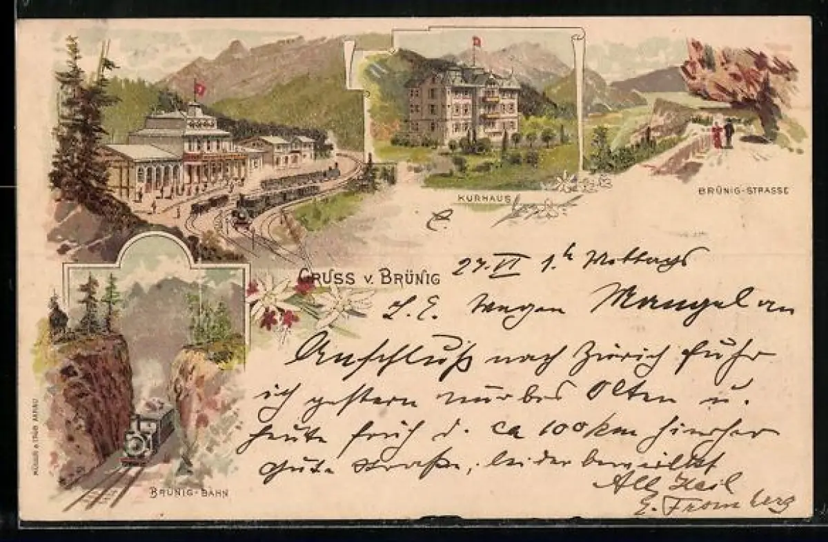 Lithographie Brünig, Brünig-Bahn, Brünig-Strasse, Kurhaus, Bahnhof