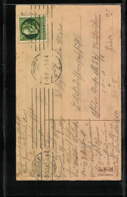 Personenbezogene Daten auf der Rückseite der Karte wurden durch blauen Textmarker unkenntlich gemacht. Die blauen Stellen sind auf die Vorderseite durchgeweicht und wirken sich negativ auf das Postkartenfoto aus