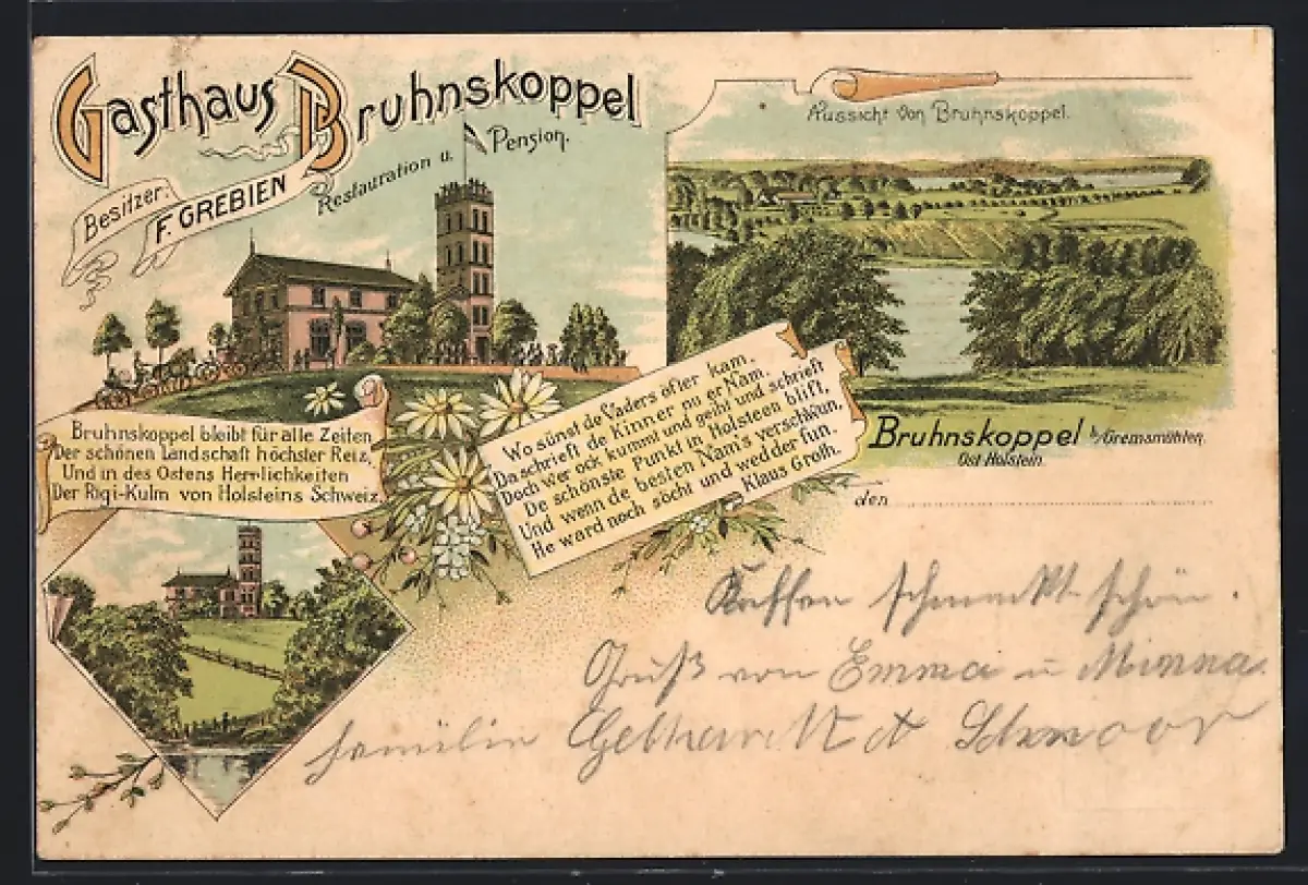 Lithographie Bruhnskoppel b. Gremsmühlen, Gasthaus Bruhnskoppel, Besitzer F. Grebien, Aussicht von Bruhnskoppel