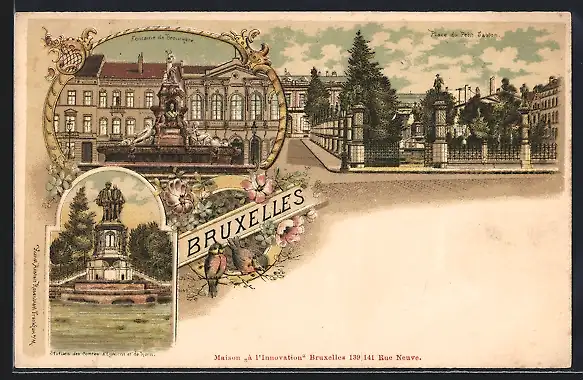 Lithographie Bruxelles, Fontaine de Brouckère, Place du Petit Sablon, Statues des Comtes d`Egment et de Horn