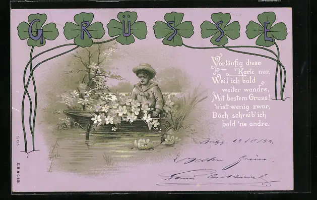 Lithographie Bub im Matrosenanzug im Boot, Kleeblätter, Aufforderung zum Schreiben von Ansichtskarten