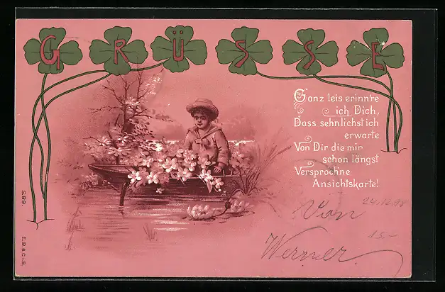 Lithographie Bub in Matrosenkleidern im Boot, Ansichtskartengeschichte, Kleeblätter