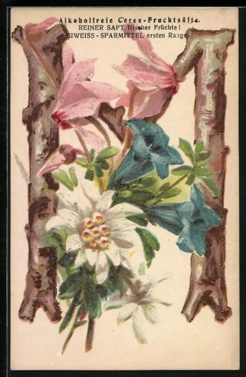 Lithographie Buchstabe M mit Blumen u. Reklame Alkoholfreie Ceres Fruchtsäfte
