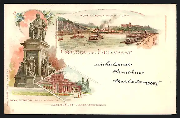Lithographie Budapest, Buda látképe, Deák szobor, Margitsziget