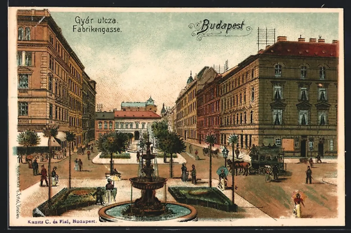 Lithographie Budapest, Fabrikengasse mit Springbrunnen