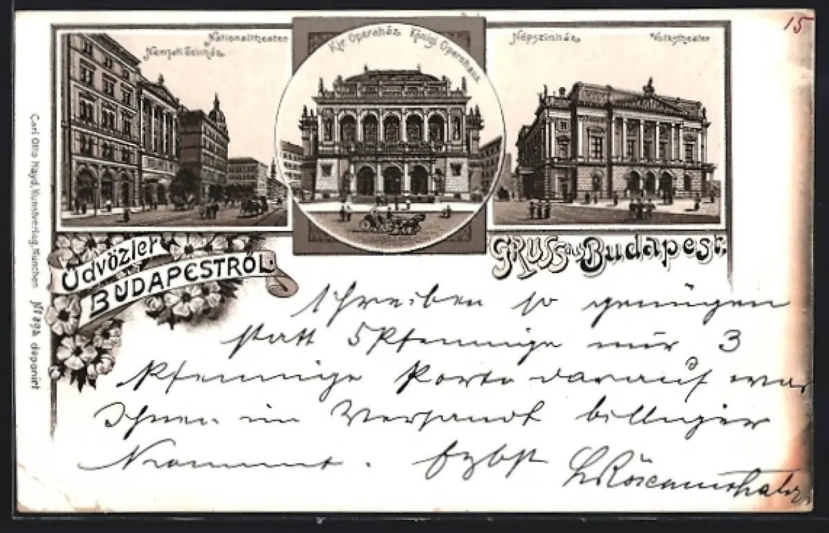 Lithographie Budapest, Königliches Opernhaus, Volkstheater, Nationaltheater
