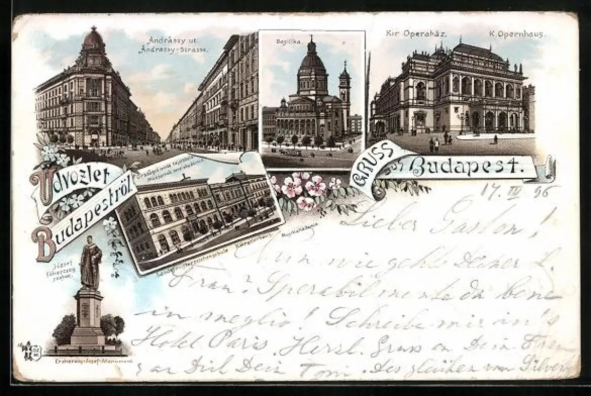 Lithographie Budapest, Opernhaus, Basilika, Andrassy-Strasse